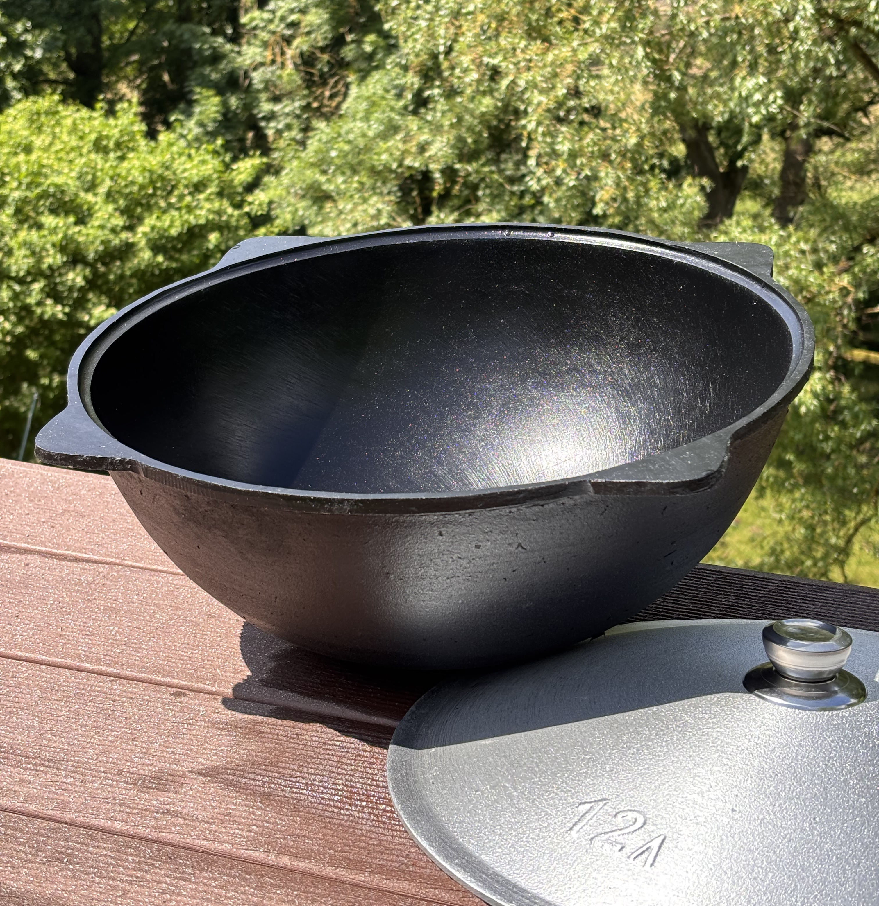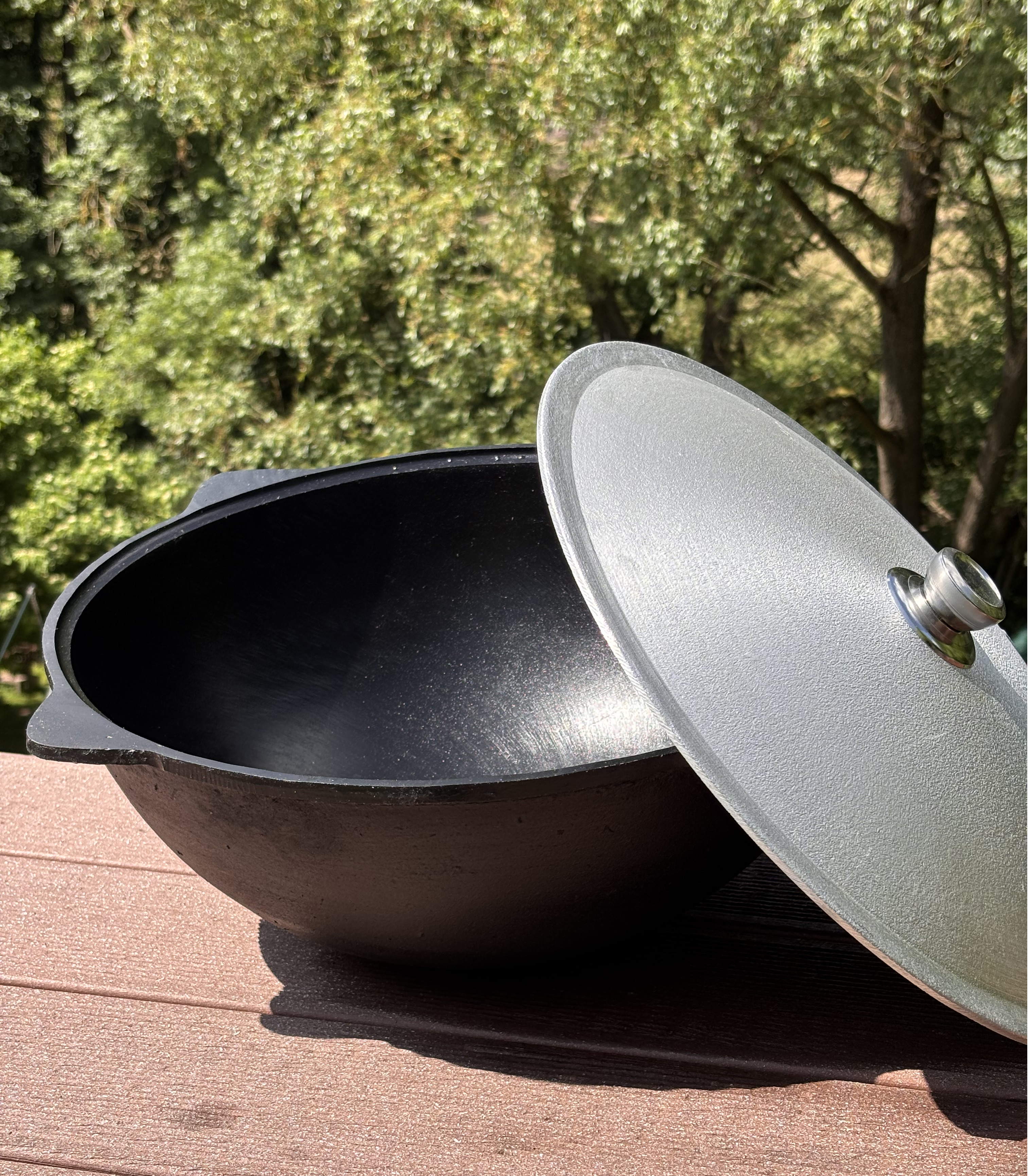 Erleben Sie die kulinarischen Wunder Zentralasiens direkt in Ihrem eigenen Garten mit einem traditionellen usbekischen Kazan aus Gusseisen. Dieser exquisite Gusseisentopf wird seit der Antike in usbekischen Küchen verwendet. Dank des Kazan zaubern Sie wunderbare Aromen und Geschmacksrichtungen in Ihren Garten. Dies ist nicht nur ein einfacher Kochtopf, sondern auch ein Tor zu einem reichen kulinarischen Erbe. Der Kazan ist mit Hanföl vorgebrannt und innen poliert. Da der Kazan und sein Aluminiumdeckel handgefertigt sind, können sie leicht variieren.