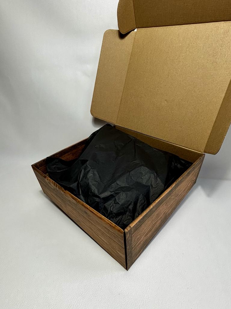 - Material: stabile Kartonbox in Holzoptik (Imitation von Holzbrettern)