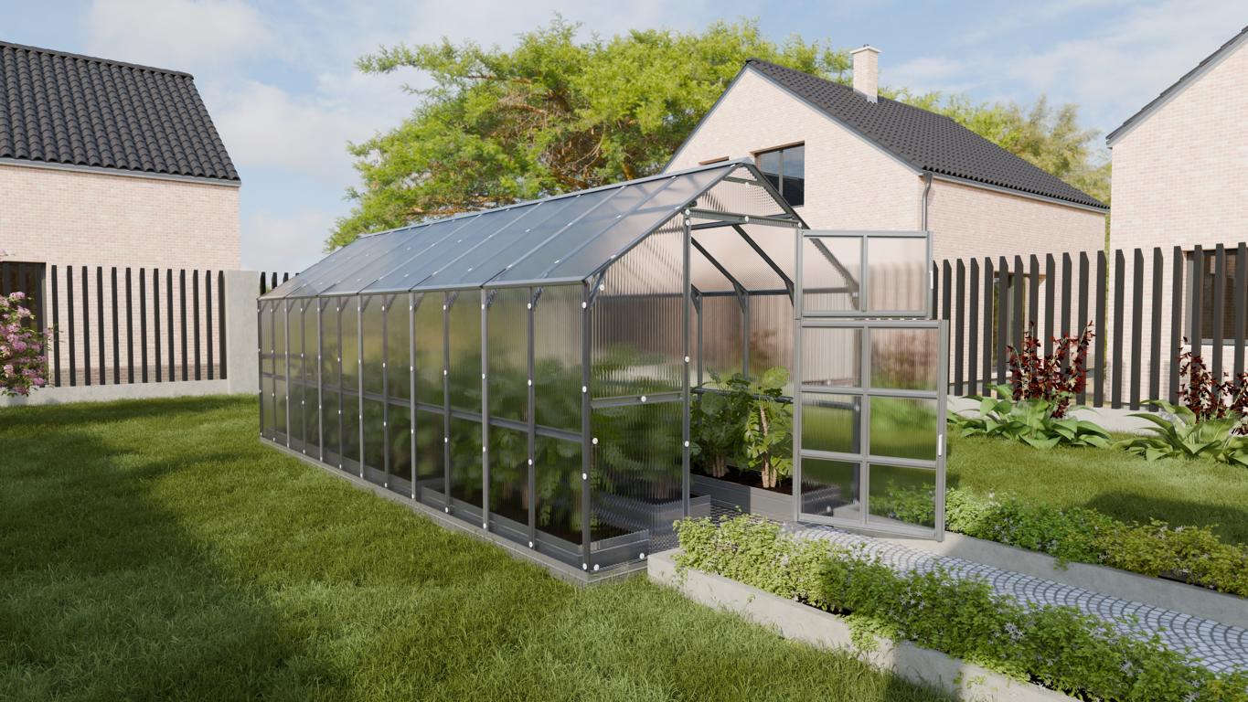 Das 2,35 m breite Haus mit 6 mm Polycarbonat und U-förmigem Stahlrahmen ist ein starkes und langlebiges Gewächshaus. Das Gewächshaus ist mit einem robusten Omega-Profil für maximale Haltbarkeit gebaut.