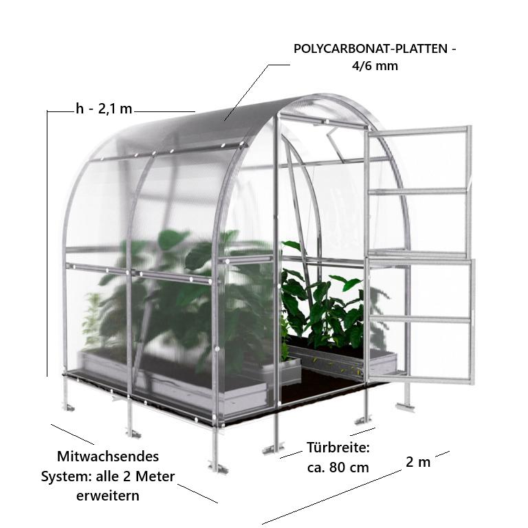 Maximaler Ertrag auf kleiner Fläche: Das 2 × 2 m Rundbogen-Gewächshaus ist ideal für kleine Gärten, Höfe oder schmale Grundstücke. Die Rundbogenform sorgt für hohe Windstabilität, während 4 mm Polycarbonat ein gleichmäßiges, pflanzenfreundliches Mikroklima schafft.
