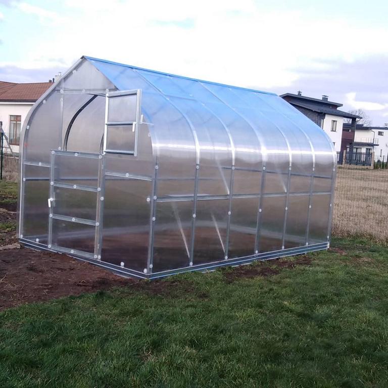 Die Abdeckung besteht aus 4 mm dickem Polycarbonat, das durch M5-Schrauben und Kunststofflaschen D40mm sicher befestigt wird. Das Material bietet hervorragenden UV-Schutz und sorgt für eine gleichmäßige Wärmeverteilung im Inneren des Gewächshauses. Die Polycarbonatplatten sind mit Gummidichtungen versehen, die verhindern, dass Staub und Schmutz in die Kanäle eindringen.