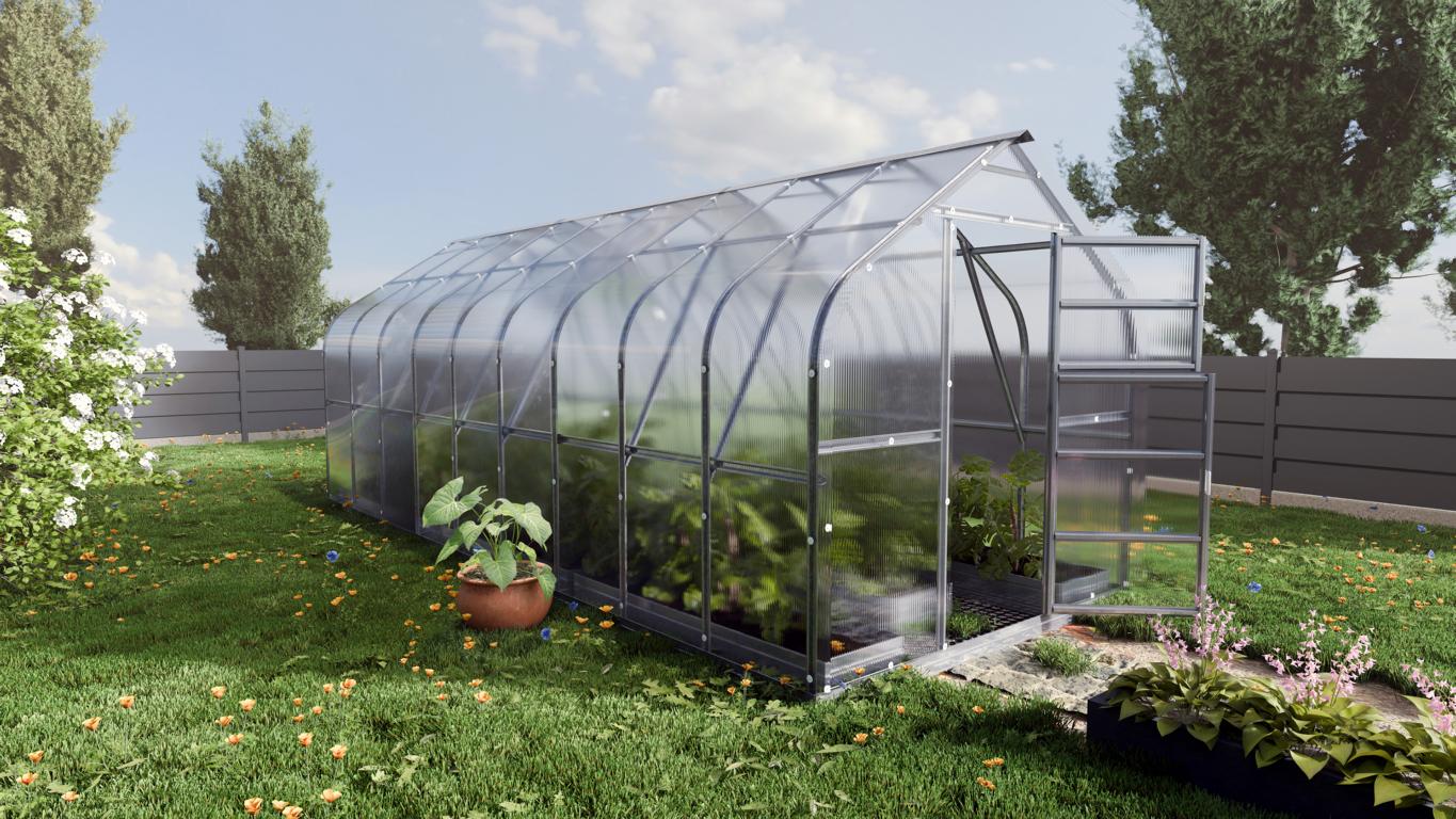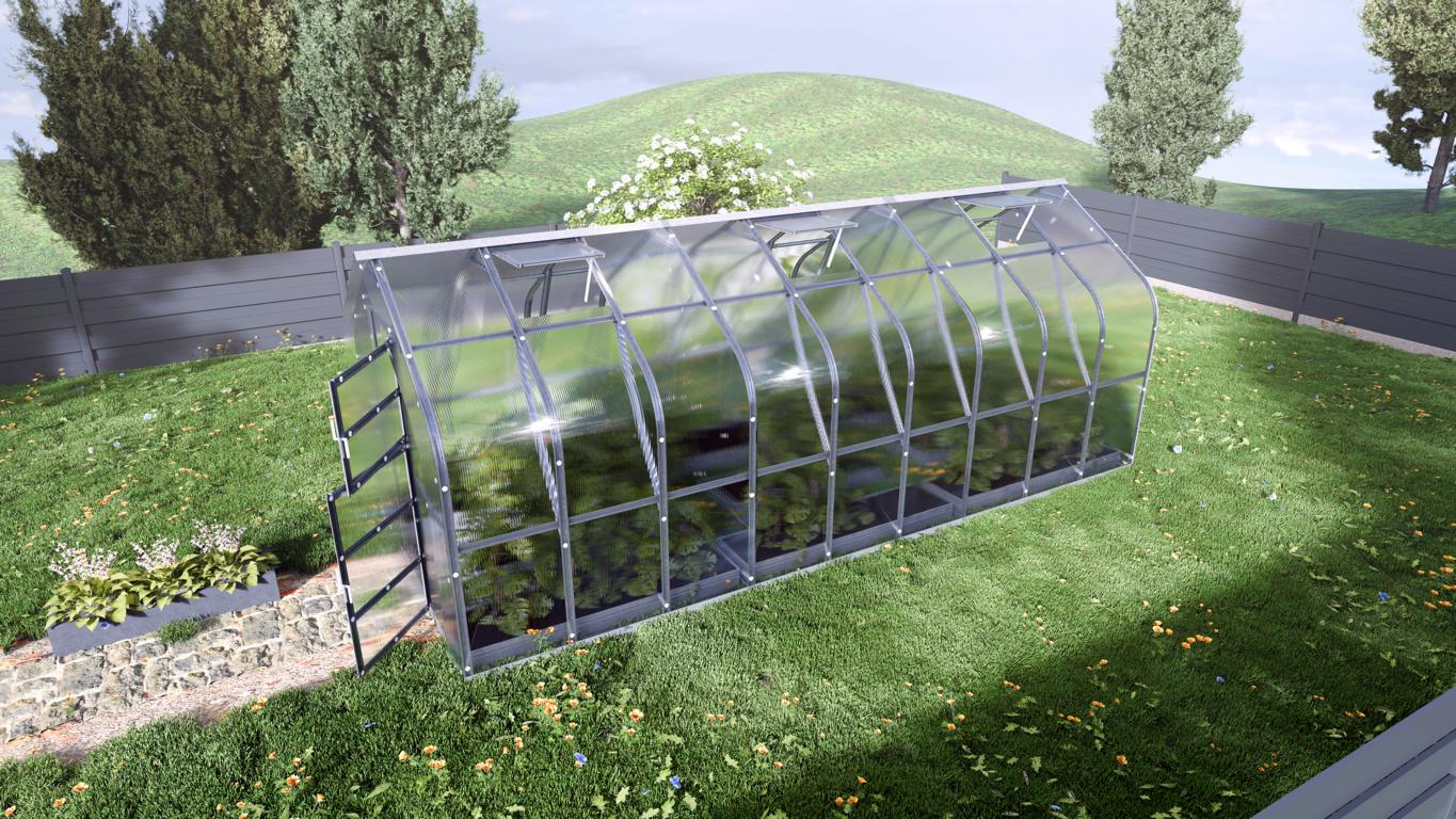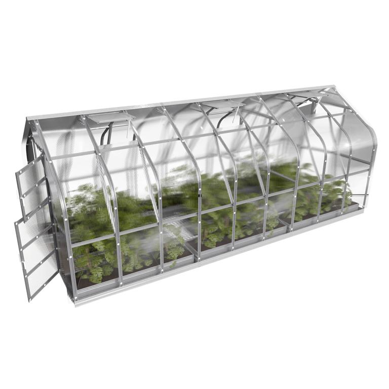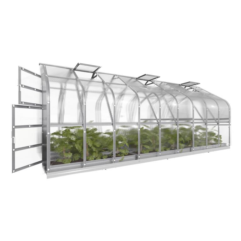 Das 2,5 m breite Standard mit 4 mm Polycarbonat. automatischer Dachfenster Öffnung und U-förmigem Stahlrahmen ist ein starkes und langlebiges Gewächshaus. Das Gewächshaus ist mit einem robusten Omega-Profil für maximale Haltbarkeit gebaut.