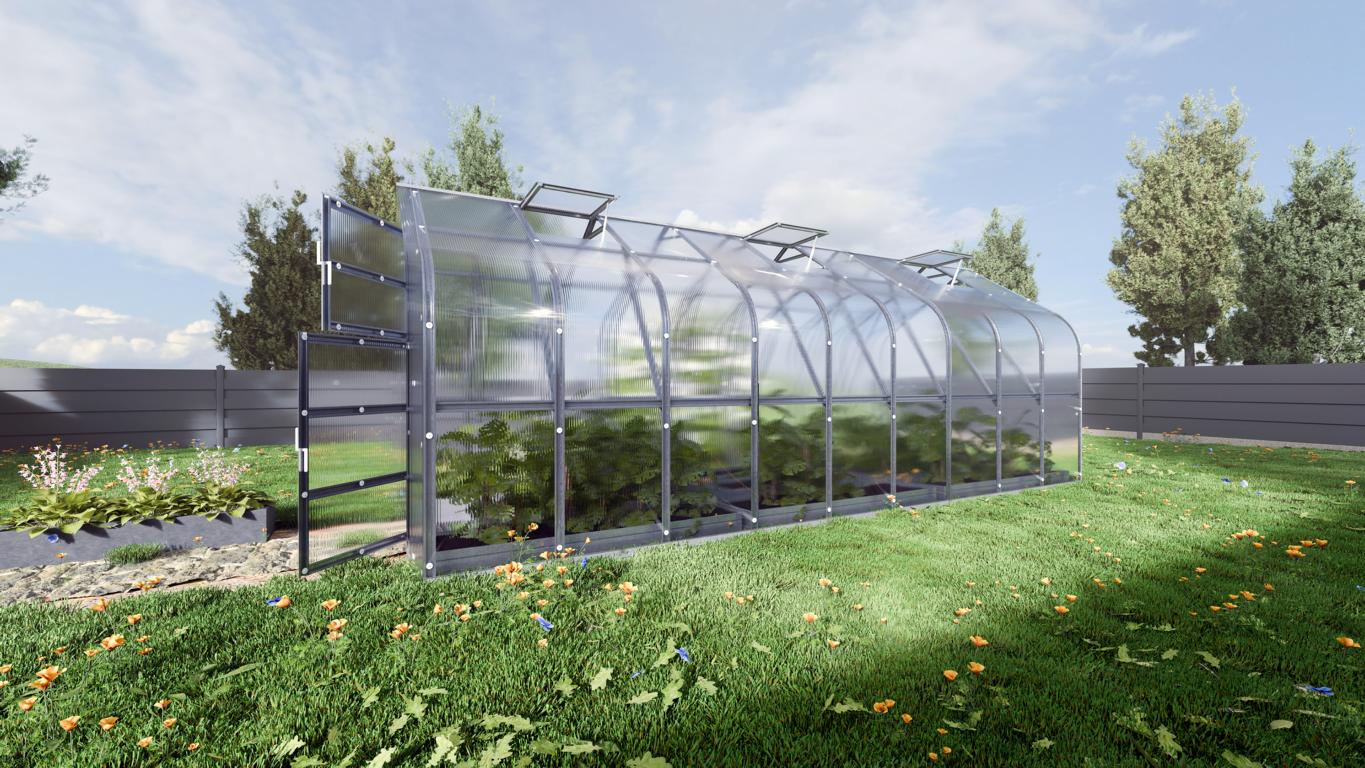 Die Abdeckung besteht aus 4 mm dickem Polycarbonat, das durch M5-Schrauben und Kunststofflaschen D40mm sicher befestigt wird. Das Material bietet hervorragenden UV-Schutz und sorgt für eine gleichmäßige Wärmeverteilung im Inneren des Gewächshauses. Die Polycarbonatplatten sind mit Gummidichtungen versehen, die verhindern, dass Staub und Schmutz in die Kanäle eindringen.