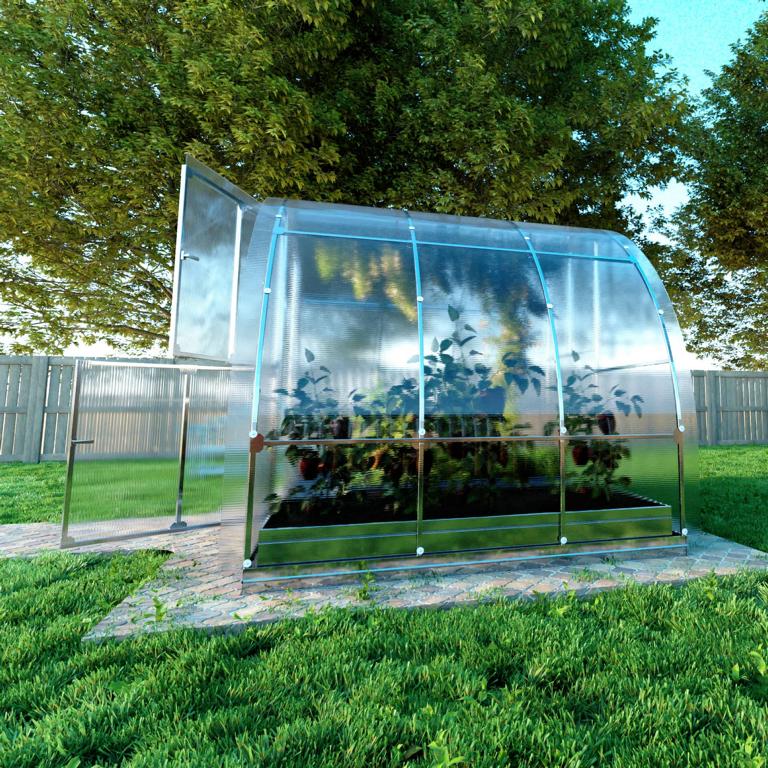 Der verzinkte Stahlrahmen und die 4 mm Polycarbonatplatten schützen zuverlässig vor Wind, Regen, Schnee und UV-Strahlung. Die Rundbogenform lässt Schnee und Wasser gut abfließen und erhöht die Stabilität.