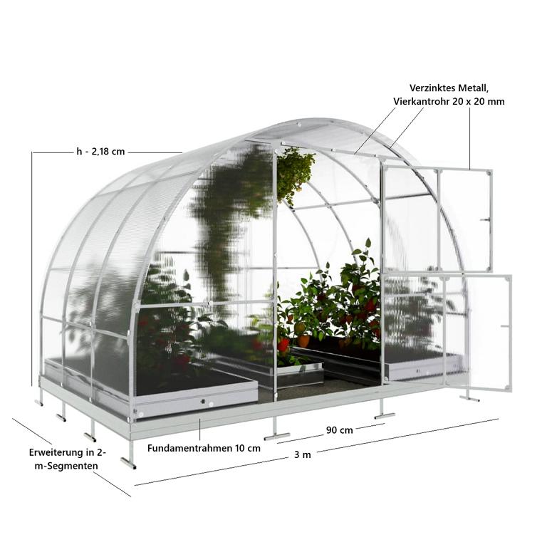 Der 3 m breite Rundbogen mit 4 mm UV-beständigen Polycarbonatplatten und einem verzinkten Stahlrahmen (Vierkantrohr 20 x 20 mm) ist ein robustes, langlebiges Gewächshaus für ganzjährige Nutzung. Modular erweiterbar in 2-m-Segmenten - ideal für Einsteiger und ambitionierte Gärtner.