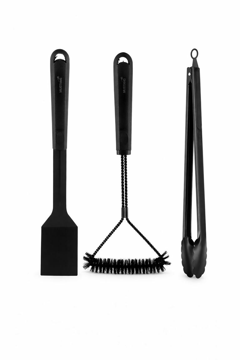 Hochwertiges Mustang Grillbesteck Set mit Reinigungsbürste ein Muss für jeden Grillliebhaber. Edelstahl Werkzeuge mit ergonomischen Griffen für komfortable und sichere Handhabung. Perfekt zum Grillen von Steaks, Fisch und Gemüse. Die Reinigungsbürste sorgt für müheloses Entfernen von Schmutz nach dem Grillen.