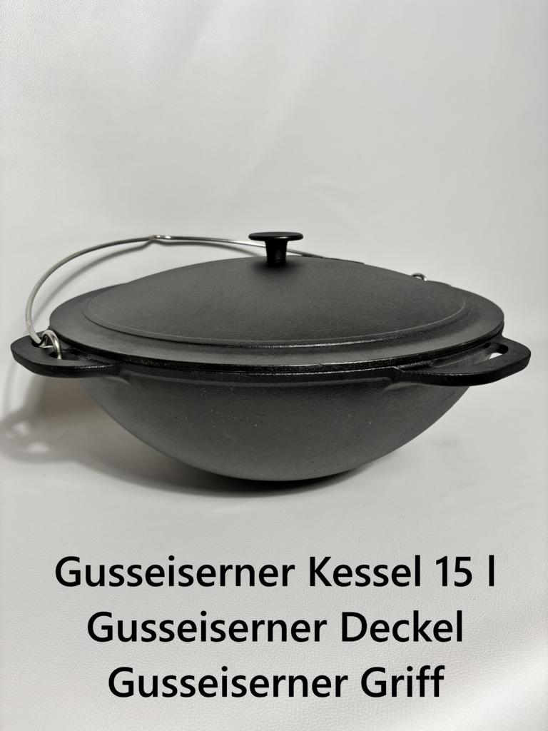 Gusseisen Kazan 15 Liter - Kessel / Schwenktopf für offenes Feuer - robuste Deckel-Lösung & sicherer Bügel fürs Umhängen