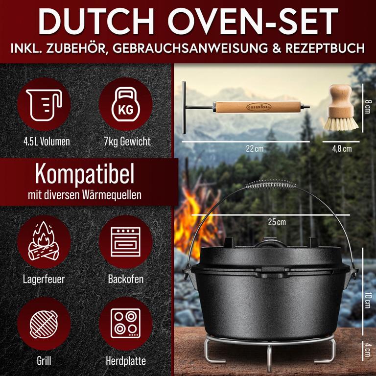 DerGusskönig 4,5 Liter Dutch Oven ist der ideale Topf für Ihre Küche und Outdoor-Abenteuer. Gefertigt aus hochwertigem, vorbehandeltem Gusseisen, gewährleistet er eine gleichmäßige Wärmeverteilung, die Ihre Gerichte perfekt zubereitet. Ob für Schmorgerichte, Eintöpfe, Brot oder Grillgerichte, dieser Dutch Oven ist vielseitig einsetzbar und robust genug für den täglichen Gebrauch. Dank des mitgelieferten 2-in-1-Deckelhebers, der Reinigungsbürste und des Rezeptbuchs sind Sie sofort startklar. Verleihen Sie Ihren Mahlzeiten einen professionellen Touch mit dem Gusskönig Dutch Oven, egal ob in der Küche, auf dem Grill oder beim Camping.